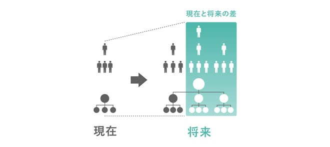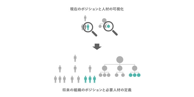 可視化された現在の戦力、そしてあるべき姿に必要な戦力の「差」を明示する必要があります。次に、何をもって戦力の定義とするか。そこは組織の役割を定義し、その役割に必要な能力を定義するポジションの可視化と、新たな将来の組織に必要なポジションの可視化があるとゴール設定を行います。職務定義を未来・現在の両軸で設定をすることが重要です。